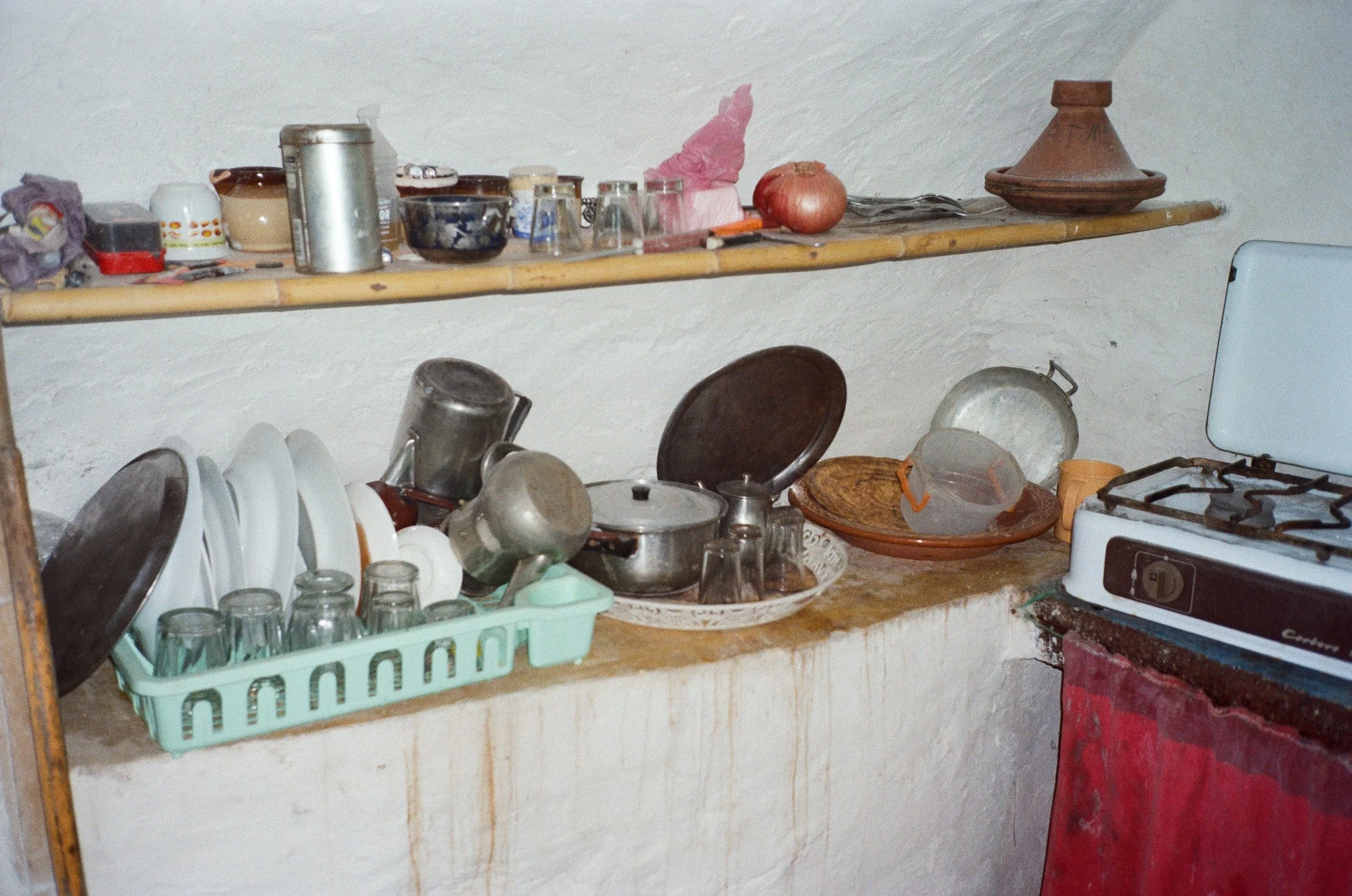 Allongé, on y devine, à travers les embruns du ciel, les étoiles blanches. Je repense à la façade de l’association. Au pied du lit, derrière les lourdes couvertures colorées, quelques affaires de pêches, des filets, et des morceaux de plastiques trouvés dans le sable. Une petite théière rouge vif, ronde et fière, a été posée là sur le plateau martelé qui reflète la lueur de la lune, renvoyant quelques traits lumineux sur les fresques murales. On y voit Brahim, bras levé, harpon érigé comme un trident, portant masque et attirail de plongée sous un bateau à moteur, un zodiac noir et blanc dont le nom est inscrit à l’arrière.