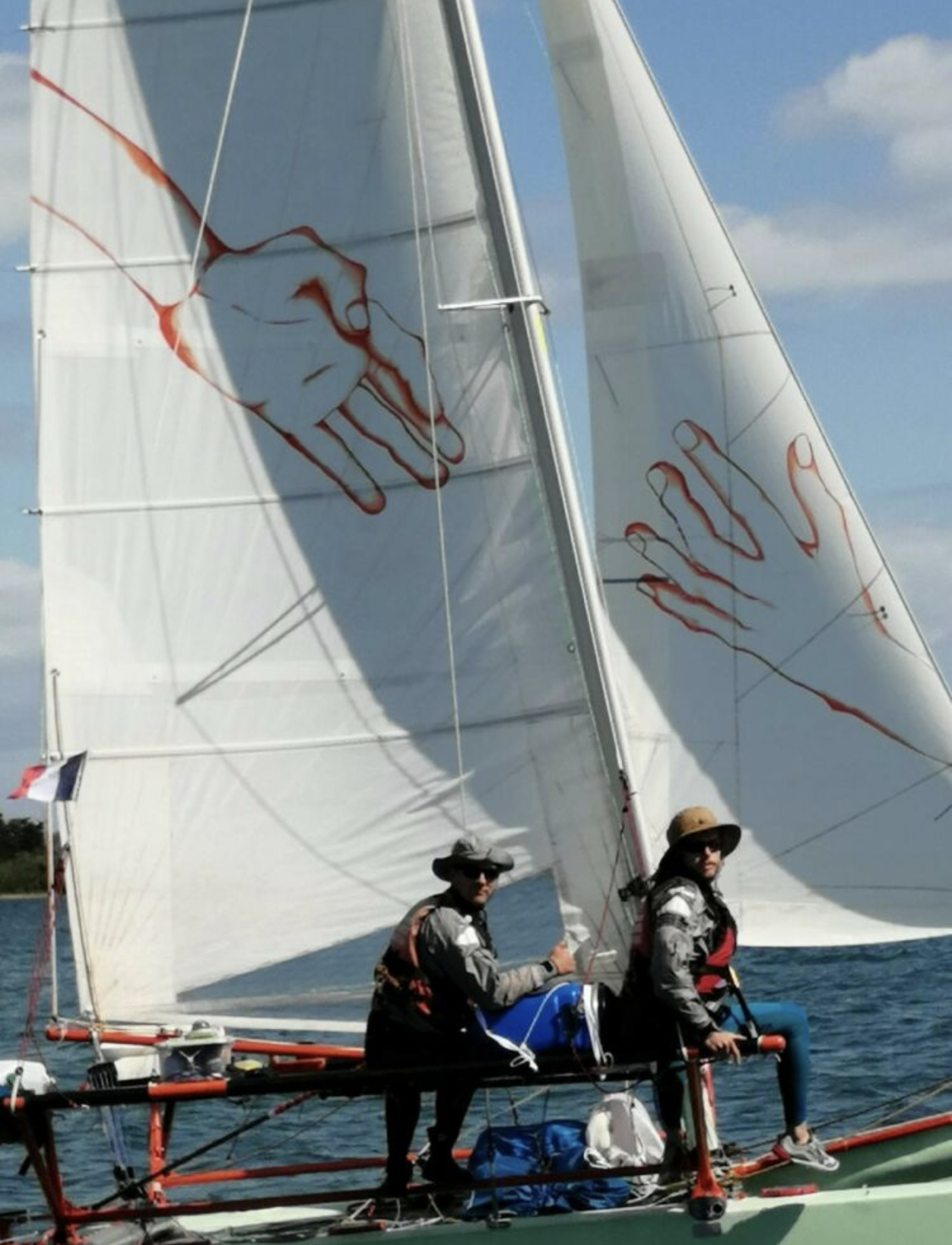 Deux tornados de courses s’en vont voguer en mers lointaines, parés de peintures que leurs équipages m’ont invitée à réaliser à la main sur leurs voilures…